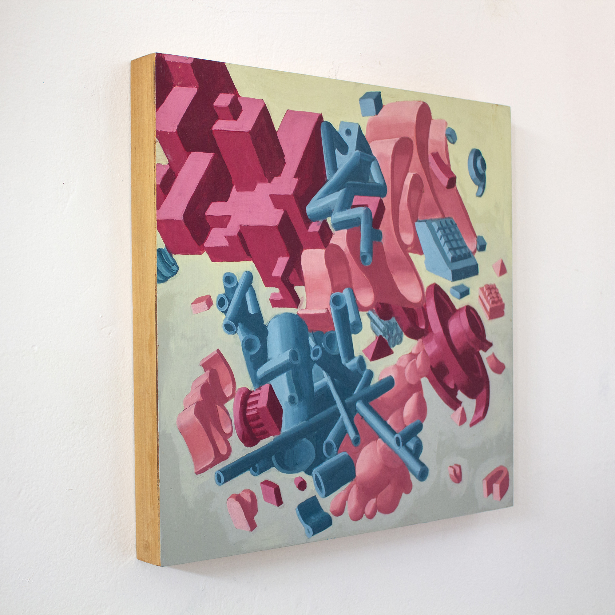 My Cloud Watching series is a shaped version of that perceptual moment. Each painting begins with a random graphic framework that gives me both structure and unpredictability. As I work, forms surface through a mix of intuition, chance, and the particular conditions of the studio. This approach becomes a way of letting the subconscious guide the image while still maintaining a loose sense of direction. The resulting compositions gather these emerging objects into a shared environment defined by its own internal logic.