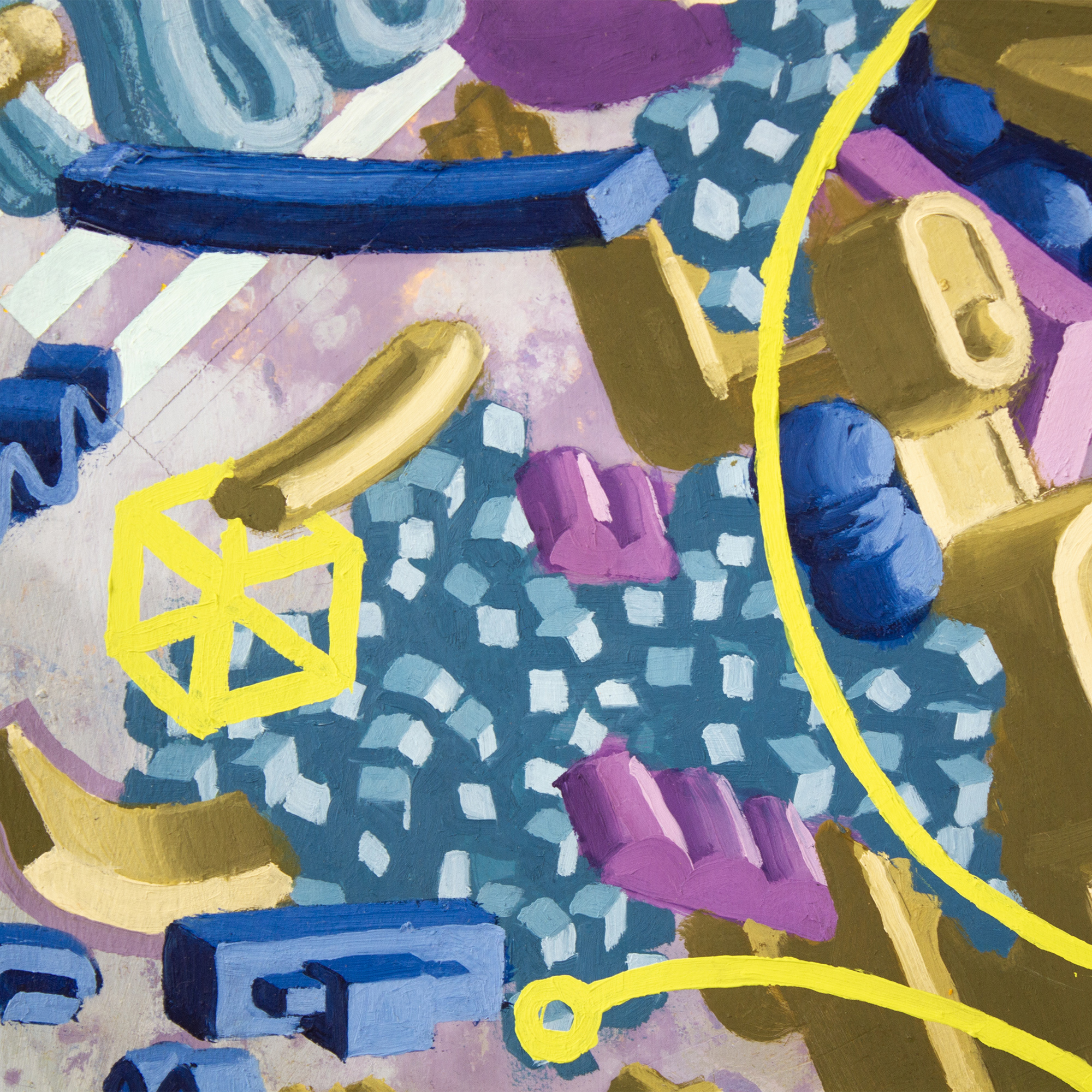 My Cloud Watching series is a shaped version of that perceptual moment. Each painting begins with a random graphic framework that gives me both structure and unpredictability. As I work, forms surface through a mix of intuition, chance, and the particular conditions of the studio. This approach becomes a way of letting the subconscious guide the image while still maintaining a loose sense of direction. The resulting compositions gather these emerging objects into a shared environment defined by its own internal logic.
