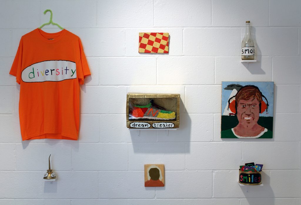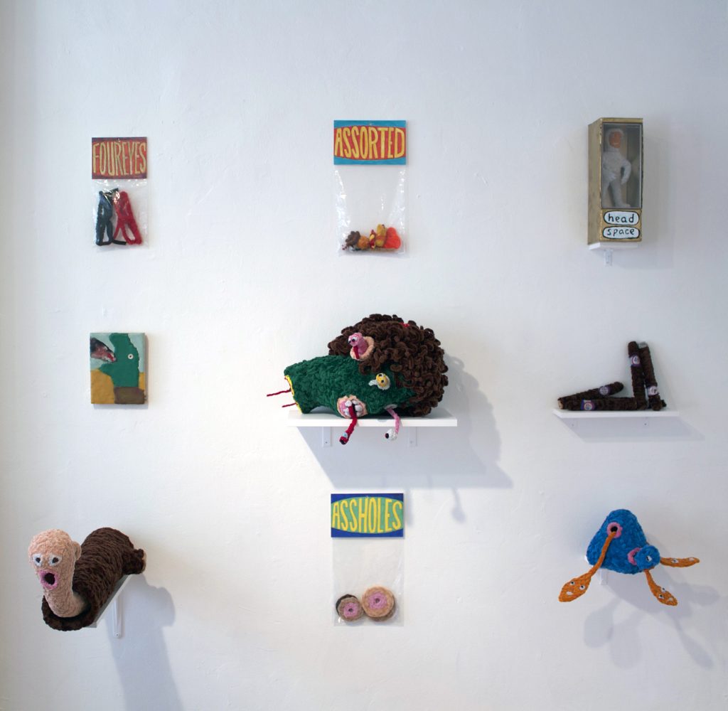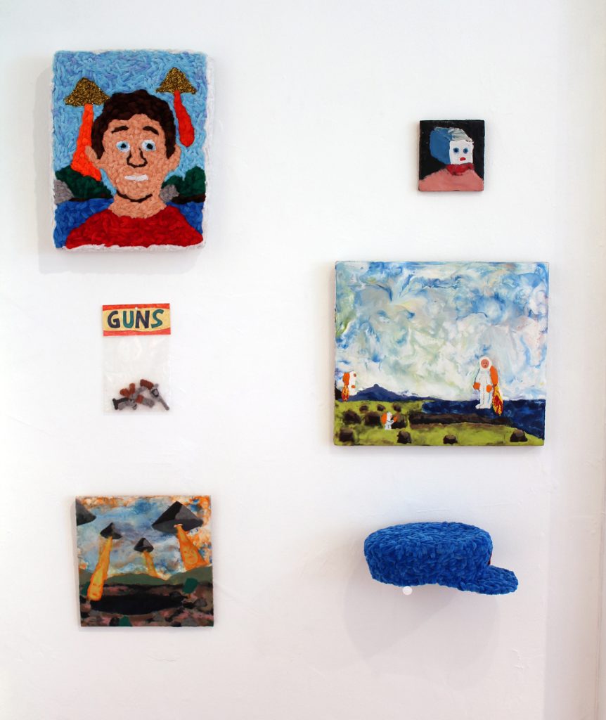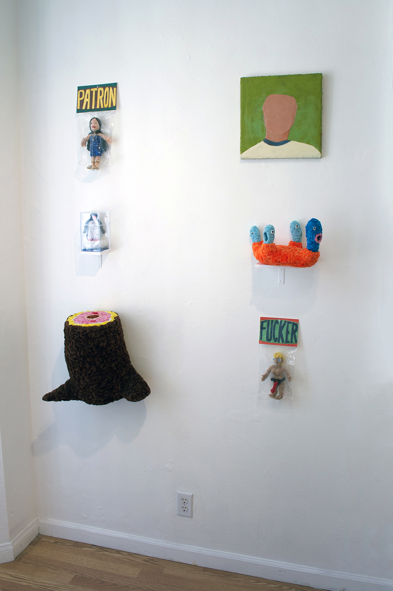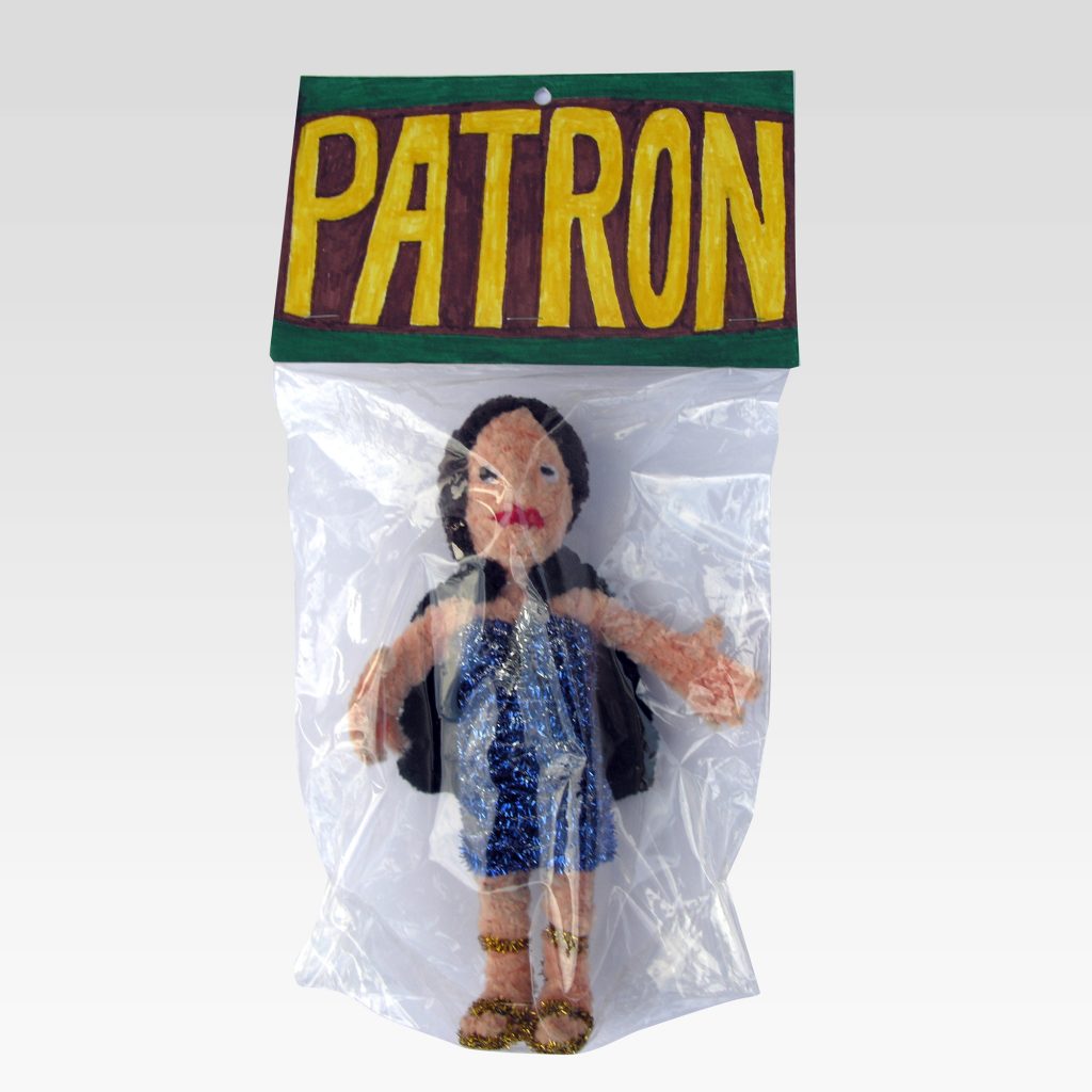 While consumer culture remains central to Porcella’s work, the absurdity of the art business also appears throughout the exhibition. Art trope avatars are apparent in Patron, Critic, Dealer, and Artist, where the sale of cheap merchandise is conflated with the sale of serious art, revealing the internal dialogue artist is faced as both the facilitator and inhibitor of their own work.