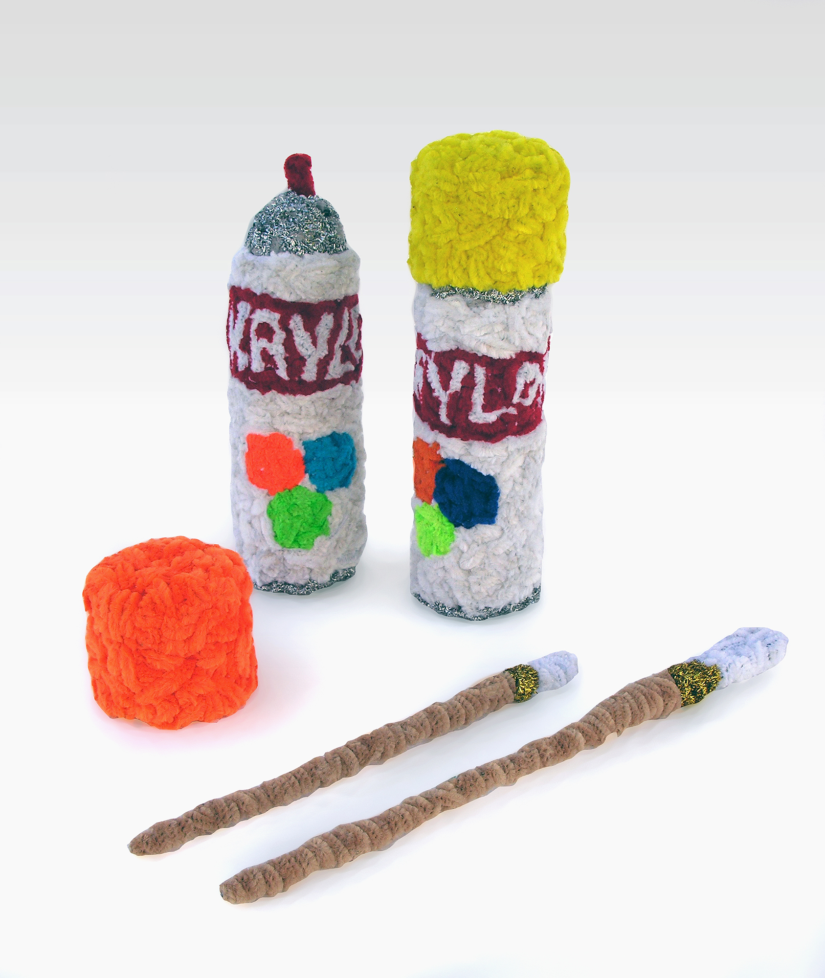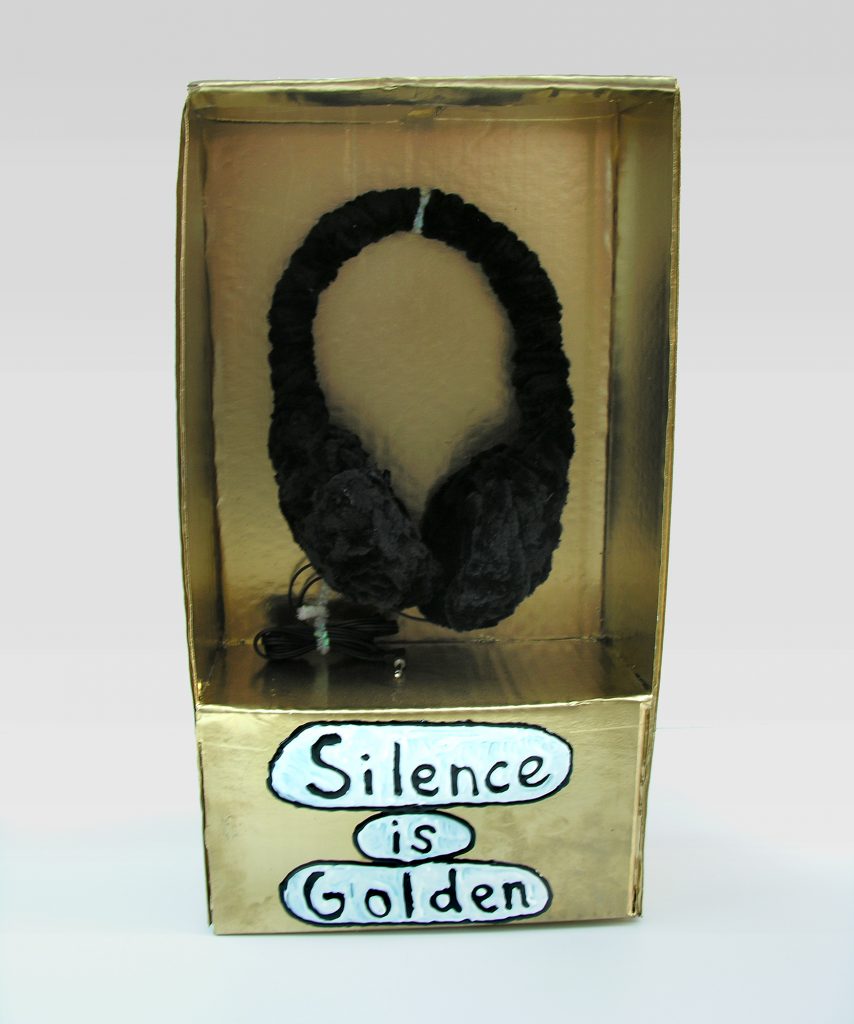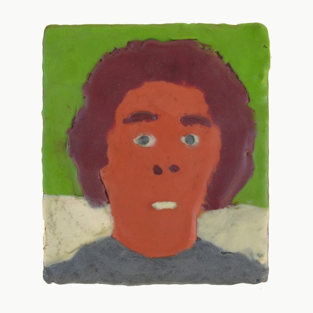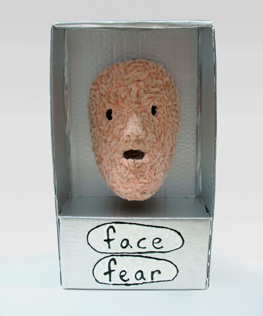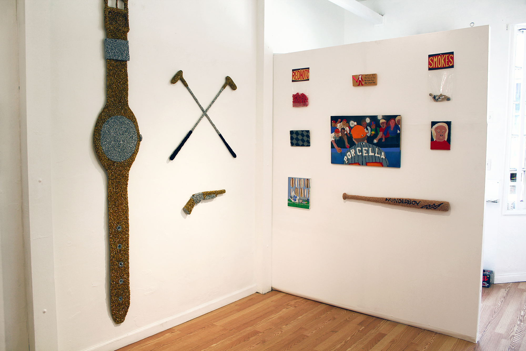 The souvenir shop is one of the few places where the average person can purchase a token symbolizing the American Dream, affording the tourist a memento of a place and time that has intense meaning. Relics from a souvenir shop are typically a cheap imitation of luxury that are made from impermanent materials, much like a film set. But unlike the polished veneer of a stage, Porcella embraces unrefined characteristics in his relics, using accessible materials like pipe cleaner, puffy paint, and cardboard, affirming the true value of the subjects represented.
