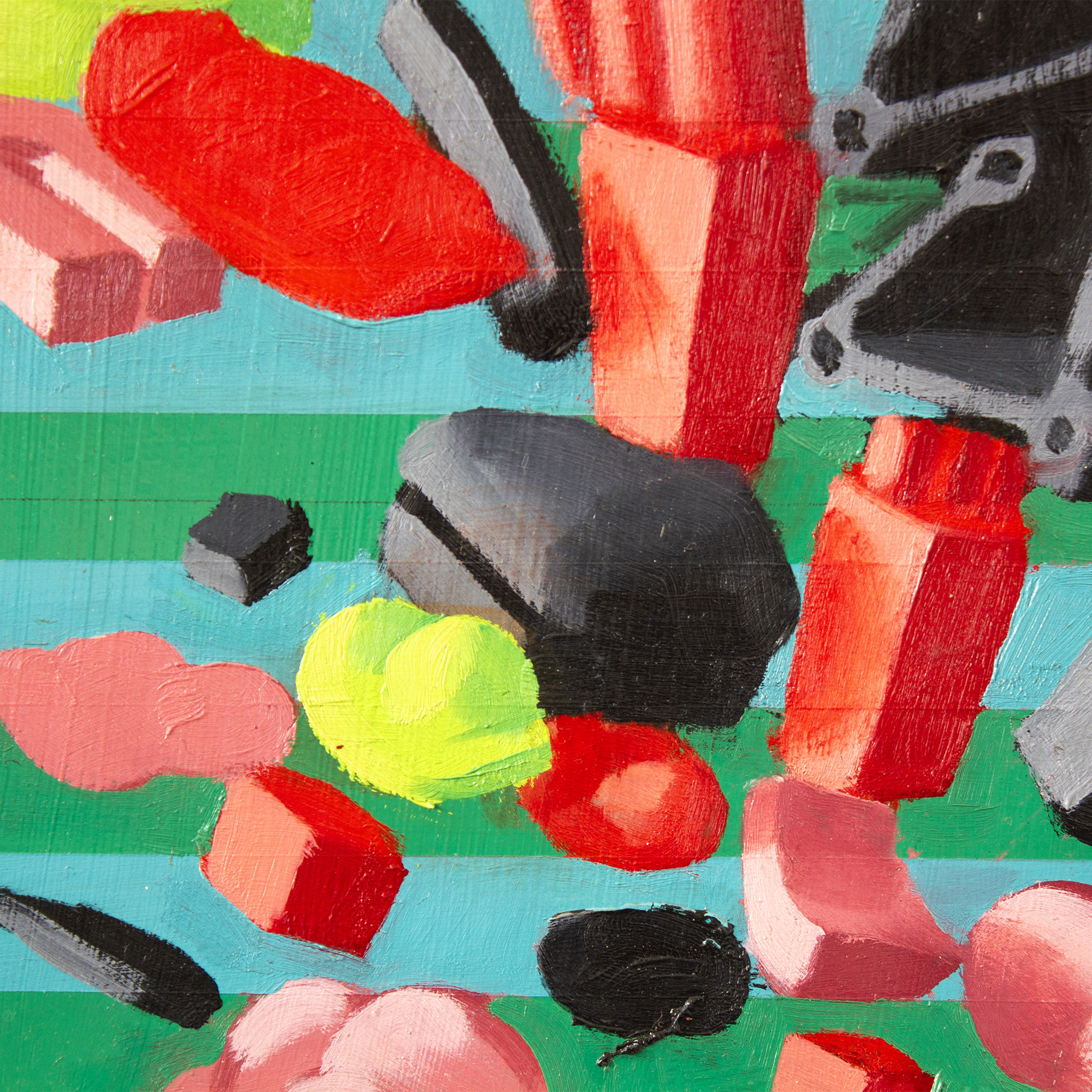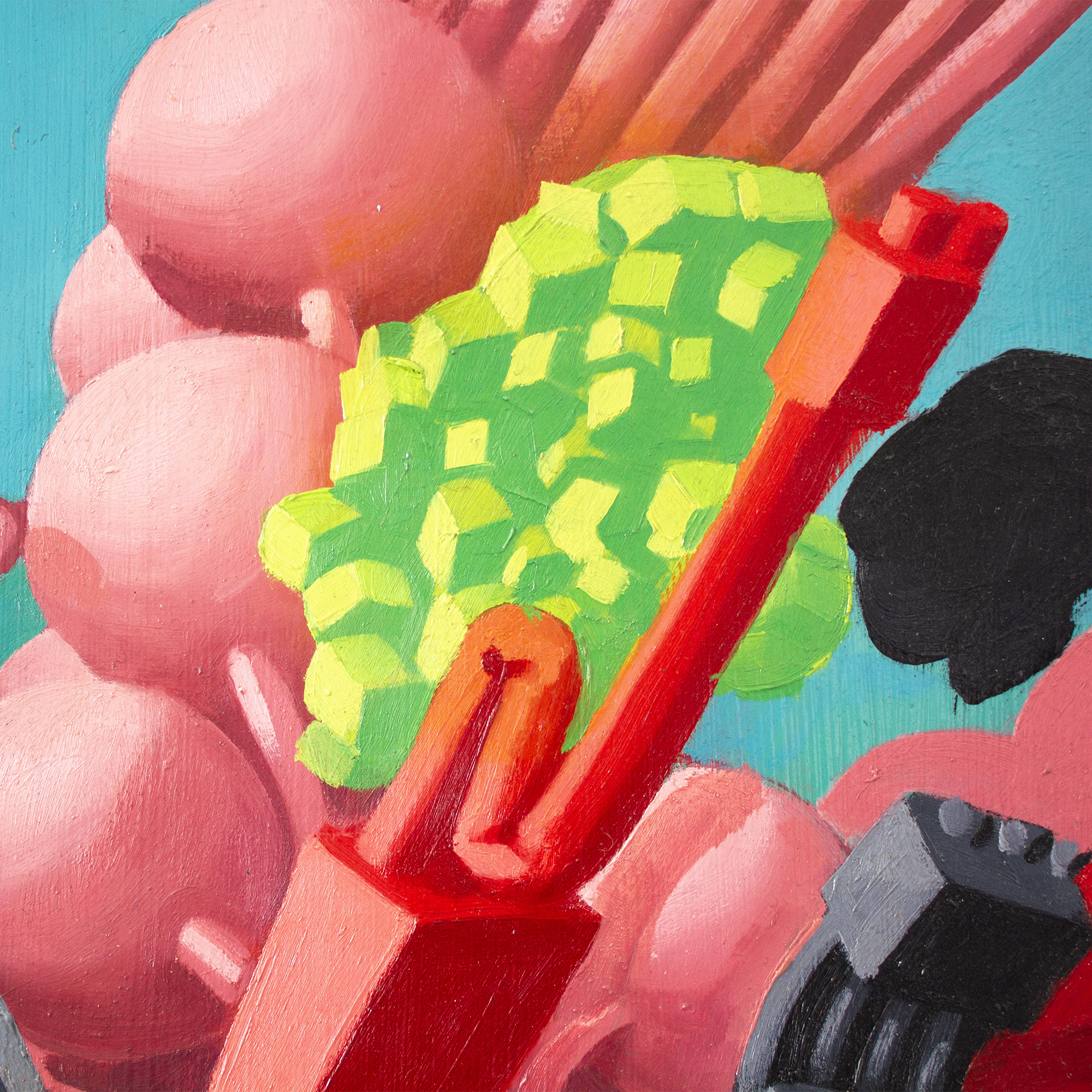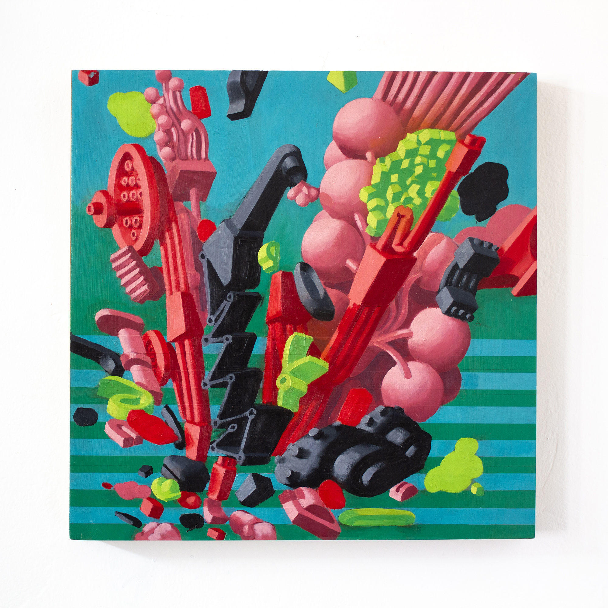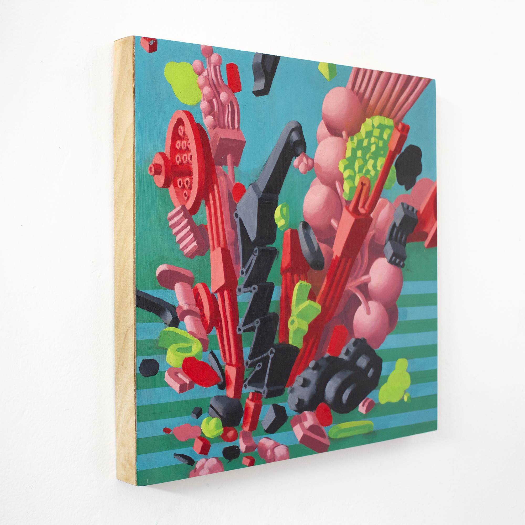 My Cloud Watching series is a shaped version of that perceptual moment. Each painting begins with a random graphic framework that gives me both structure and unpredictability. As I work, forms surface through a mix of intuition, chance, and the particular conditions of the studio. This approach becomes a way of letting the subconscious guide the image while still maintaining a loose sense of direction. The resulting compositions gather these emerging objects into a shared environment defined by its own internal logic.